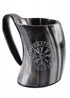 Dieser großzügig bemessene Henkelbecher / Humpen wird aus Rinderhorn in Handarbeit gefertigt, poliert, und verziert mit einem eingravierten Vegvísir umrandet von einer Runenfolge.